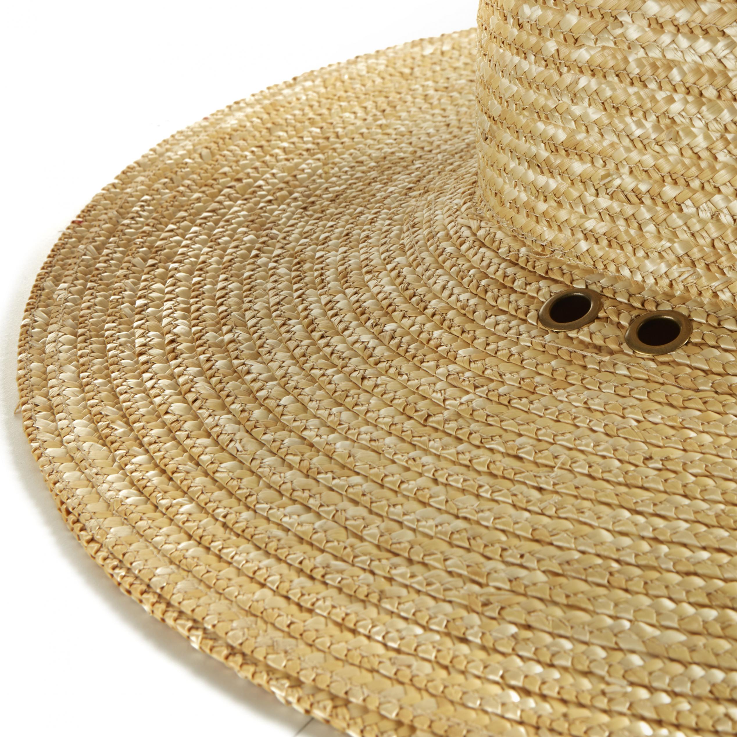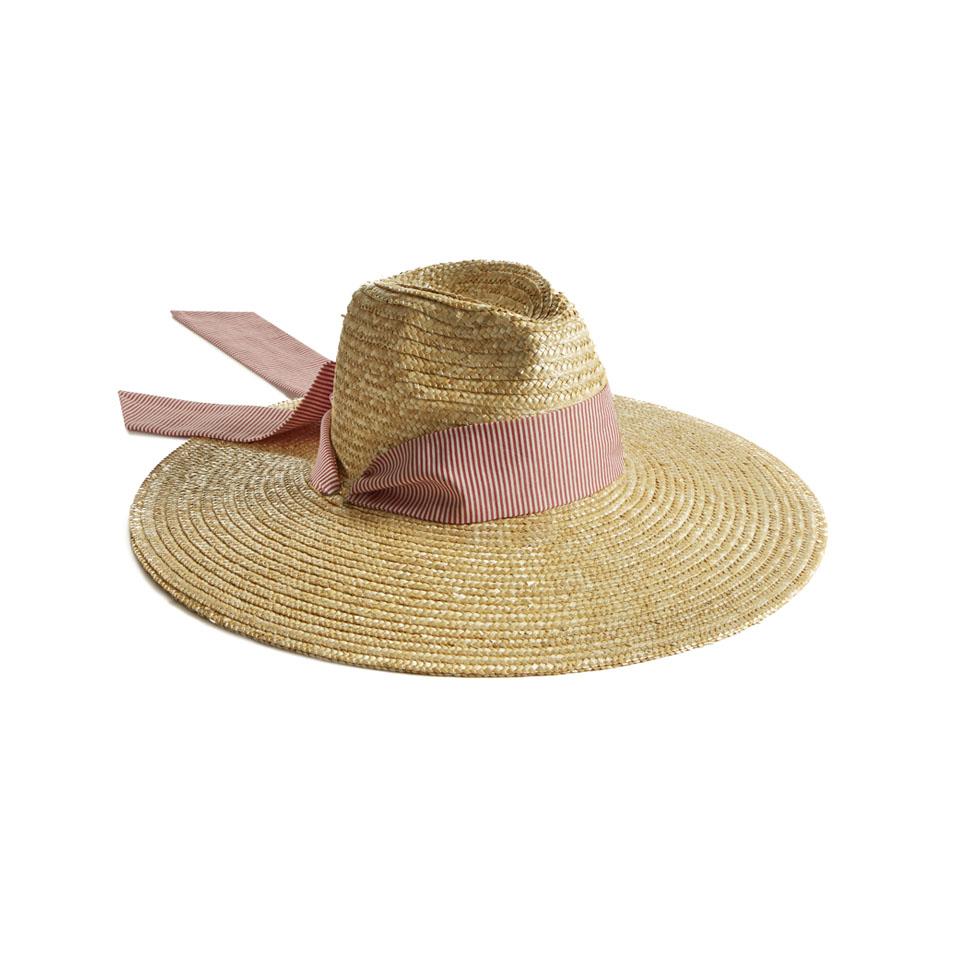100% natural straw hat entirely woven and sewn by hand. Medium-wide, semi-rigid, modeled brim. 100% cotton ribbon, red striped. Customizable with initials inside or on the ribbon. Delivery within 15 - 20 days.