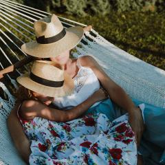 100% natural straw hat entirely woven and sewn by hand. Semi-rigid, medium wide brim. Headband with a blue grosgrain bow. Customizable with initials inside.