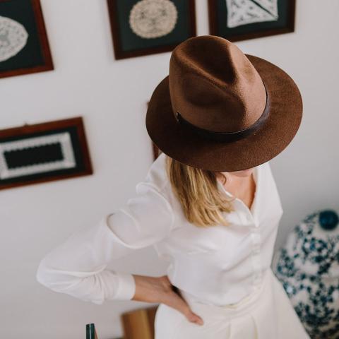 Materiale 100% pelo di lepre, effetto velour. Falda larga 6,5 cm, consistenza rigida donante ai lati. Fascia in camoscio, marocchino interno in cuoio.